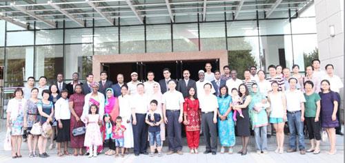 会后,学校领导与毕业外国留学生们合影留念。