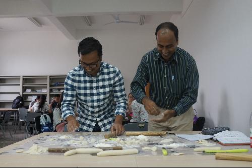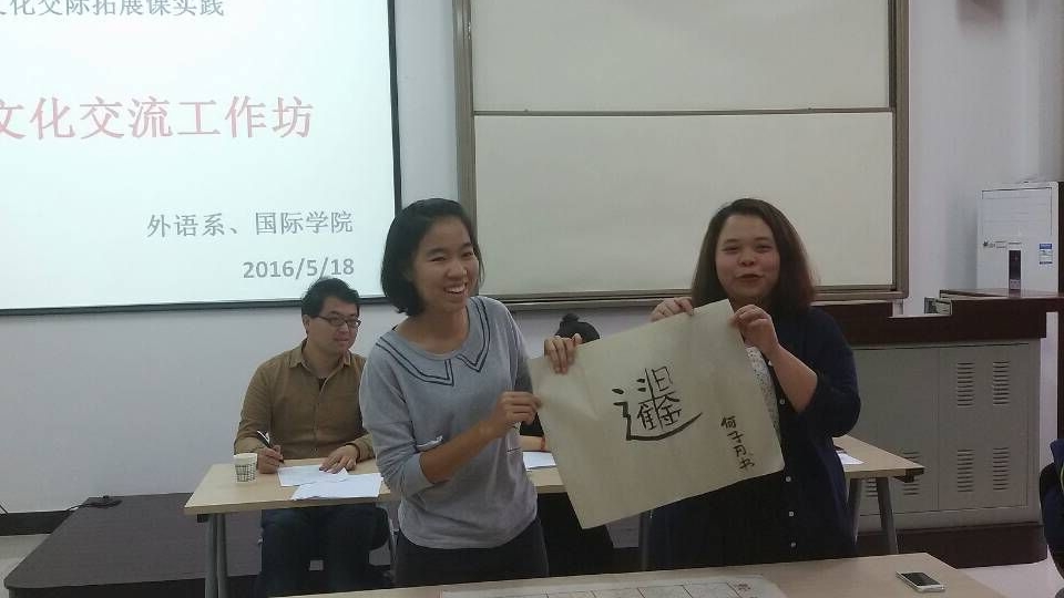 不同于以往,课堂里的“老师”是来自我校不同学院30名选修跨文化交际拓展实践课的大二本科生,“师生们”分成六组在规定时间内或用英语、或用汉语、或用肢体语言交流学习如何包饺子、剪纸、写毛笔字、打麻将、画脸谱、打太极拳等。