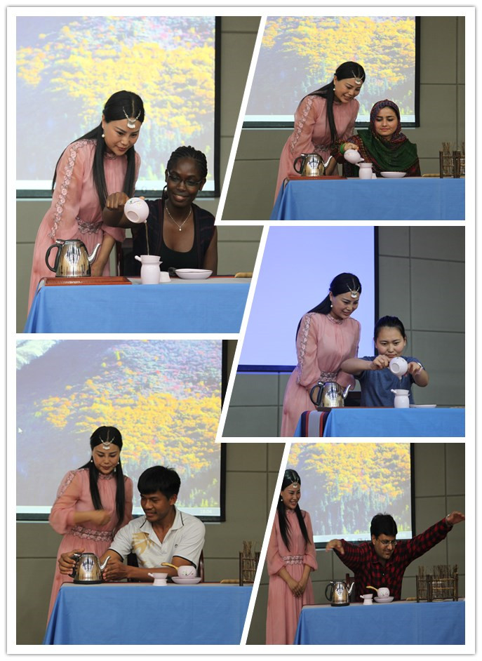 一曲过后,来自蒙古、卢旺达、巴基斯坦、柬埔寨等国家的留学生纷纷登台,在茶艺师的指导下,尝试着学习表演茶艺,给不同国家的留学生奉茶。“最后一杯茶送给尊敬的老师”巴基斯坦留学生高云天对组织老师的中国式感谢,将活动融洽欢快的氛围推向了高潮。