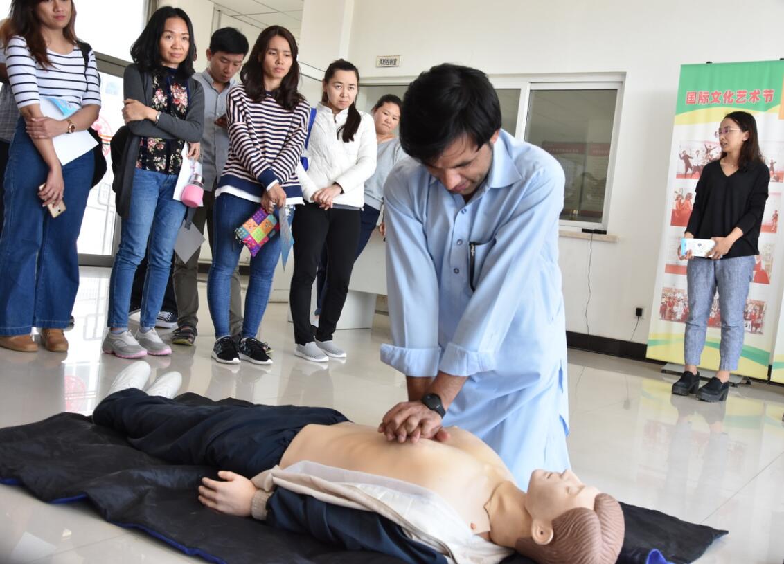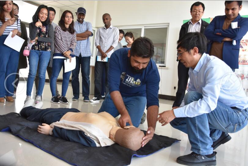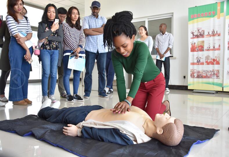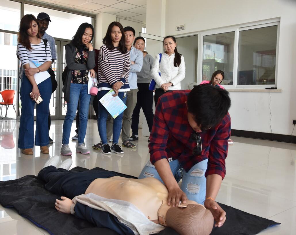 心肺复苏培训环节,医生采用理论知识培训与模拟演练相结合的方式,现场进行了指导培训,给留学生上了一堂生动直观的急救技巧课。在观摩了医生的急救示范后,留学生们也纷纷尝试亲自操作,现场实践了安全自救和互救的基本技能技巧。