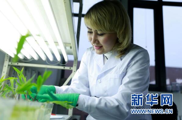 阿丽腾·沙亚克麦托娃正在进行离子液对玉米幼苗生长的影响试验